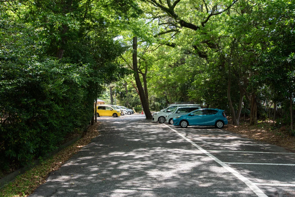 境内を囲むように、約80台分の無料駐車場が整備されています。出入口や通路はやや狭いため、混雑時の運転にはご注意ください。