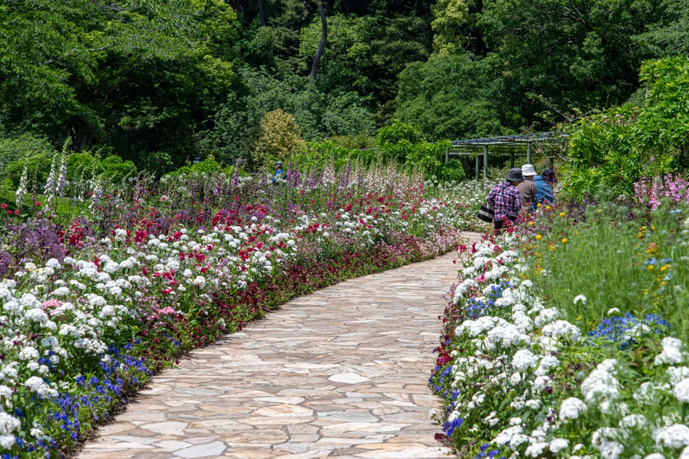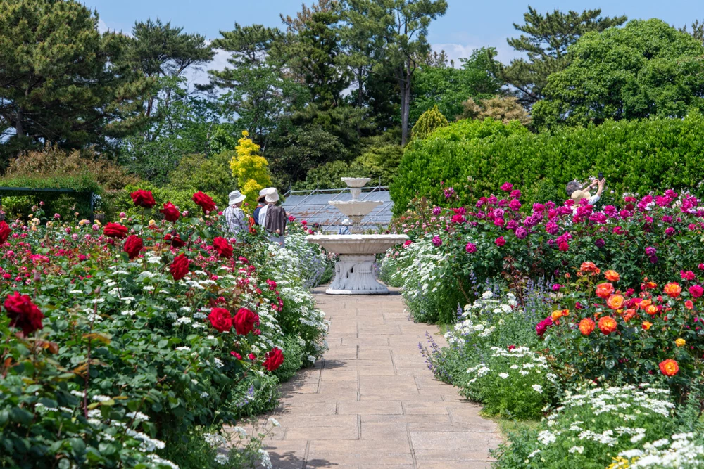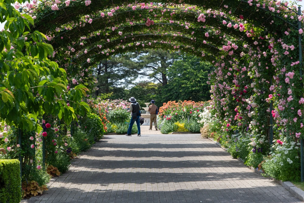 「花といえばバラ」と思い浮かべる方も多いのではないでしょうか。ちょうど見頃を迎えたローズガーデンには、平日にもかかわらず多くの来園者が訪れ、にぎわいを見せていました。