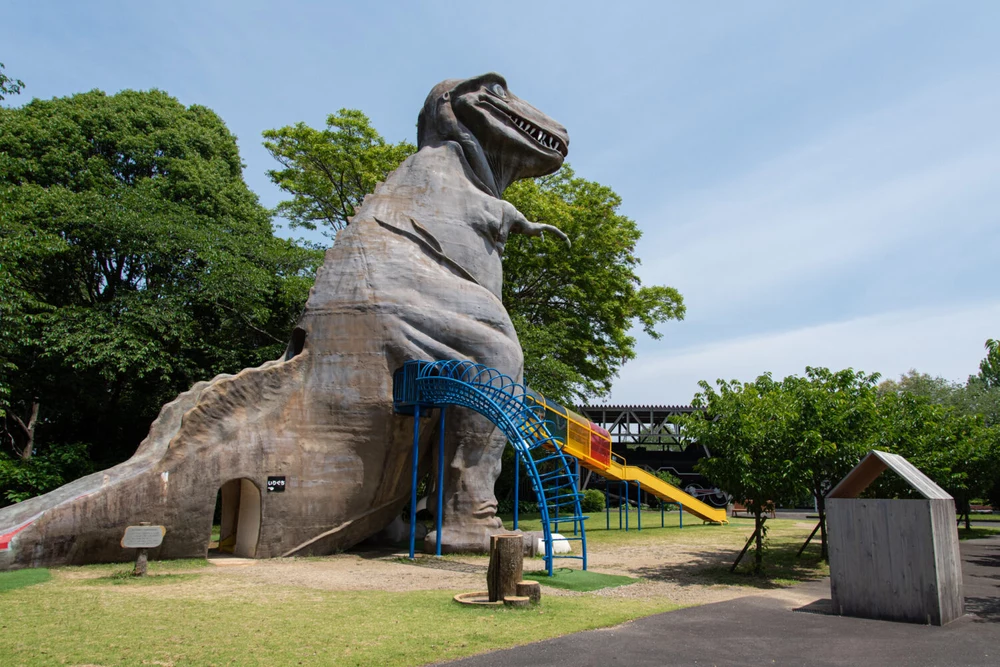 大迫力の恐竜すべり台が目を引く「こども広場」は、小さな遊園地のようなエリアです。