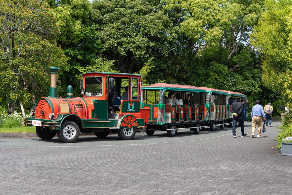 正面ゲート前をスタートに園内の一部を1周(約15分)するフラワートレイン。停留所が6か所あるので、目当ての場所で降りたり、途中で疲れてしまった方も正面ゲートまで乗せて行ってくれます。