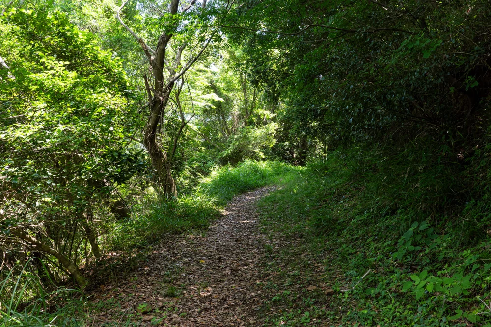 展望台までは、徒歩6〜10分の山道ハイキングです。6月末に訪れると、緑が深く茂り、少し薄暗い道が続きます。一人で歩くには少し心細く感じながら、早足で展望台を目指します。