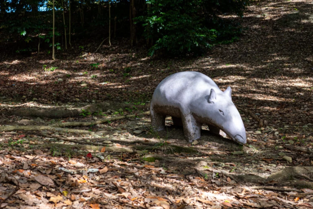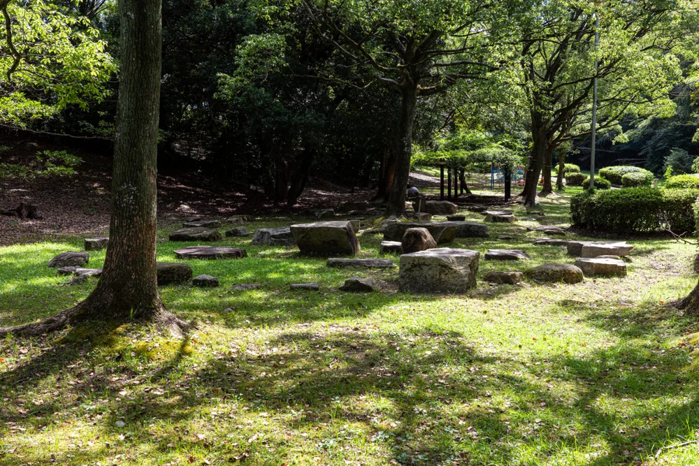 木陰が心地よい芝生エリアには、大小さまざまな岩が配置されています。飛び石のようにも、腰掛けのようにも見え、訪れた人の自由な楽しみ方ができそうな空間です。
